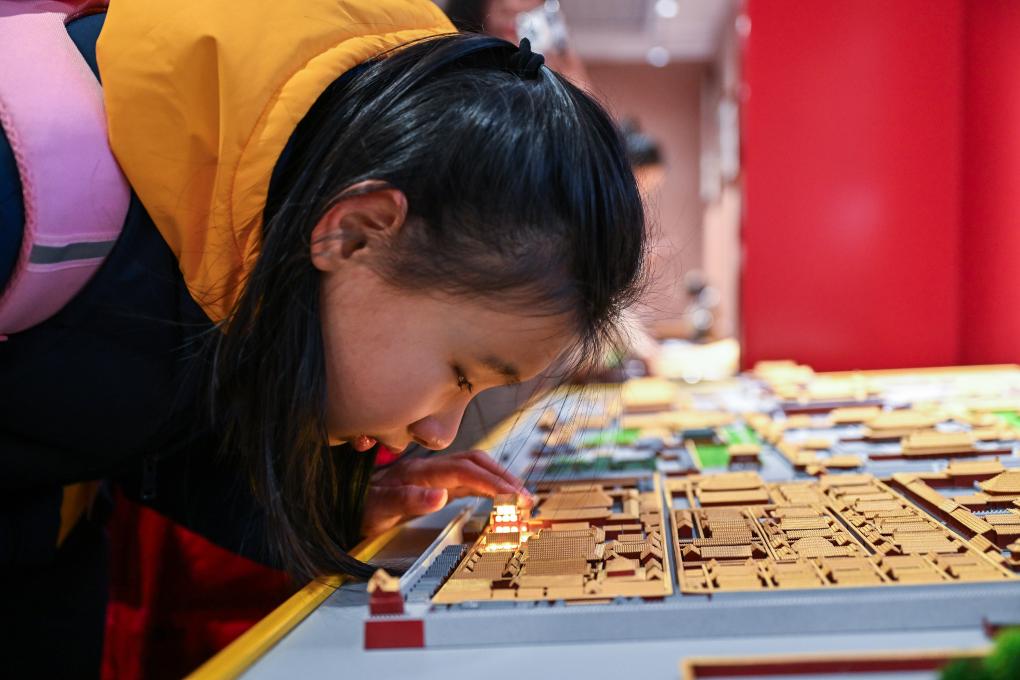 A student from the Beijing School for the Blind touches a sand table model of the Palace Museum at Sensory Experience Gallery of the Palace Museum in Beijing, capital of China, Dec. 1, 2024. (Xinhua/Li Xin)