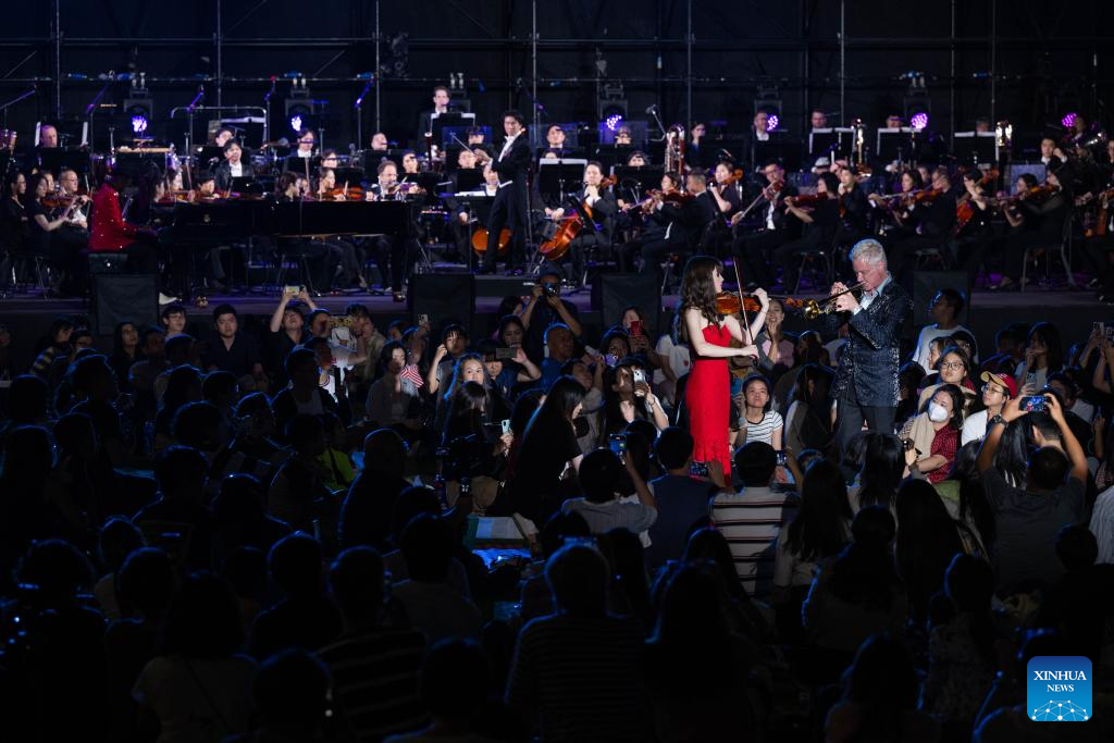 People enjoy an open-air concert at Macao Cultural Center Square in south China's Macao, Nov. 16, 2024. This year marks the 25th anniversary of Macao's return to the motherland. After 25 years of development, Macao has become a world renowned tourism destination, where Eastern and Western cultures have co-existed for over 400 years. (Xinhua/Cheong Kam Ka)