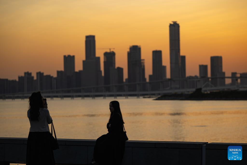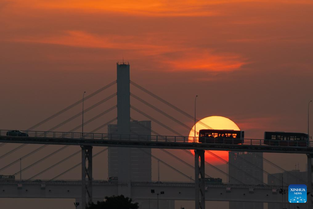 People view sunset in south China's Macao, Nov. 30, 2024. This year marks the 25th anniversary of Macao's return to the motherland. After 25 years of development, Macao has become a world renowned tourism destination, where Eastern and Western cultures have co-existed for over 400 years. (Xinhua/Cheong Kam Ka)