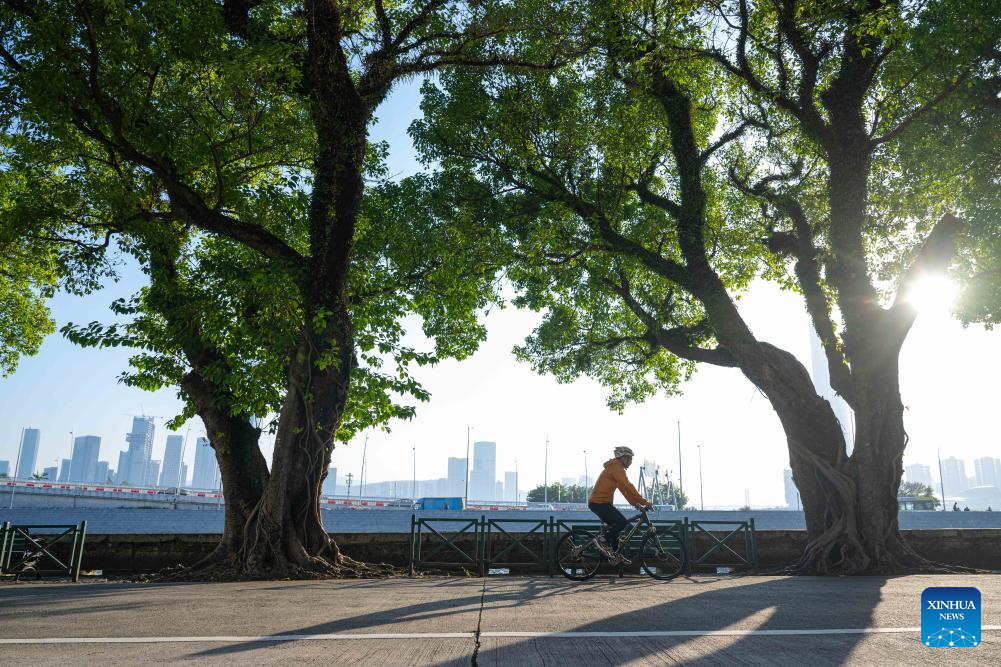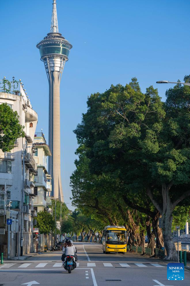 A cyclist rides along a street in south China's Macao, Dec. 2, 2024. This year marks the 25th anniversary of Macao's return to the motherland. After 25 years of development, Macao has become a world renowned tourism destination, where Eastern and Western cultures have co-existed for over 400 years. (Xinhua/Cheong Kam Ka)