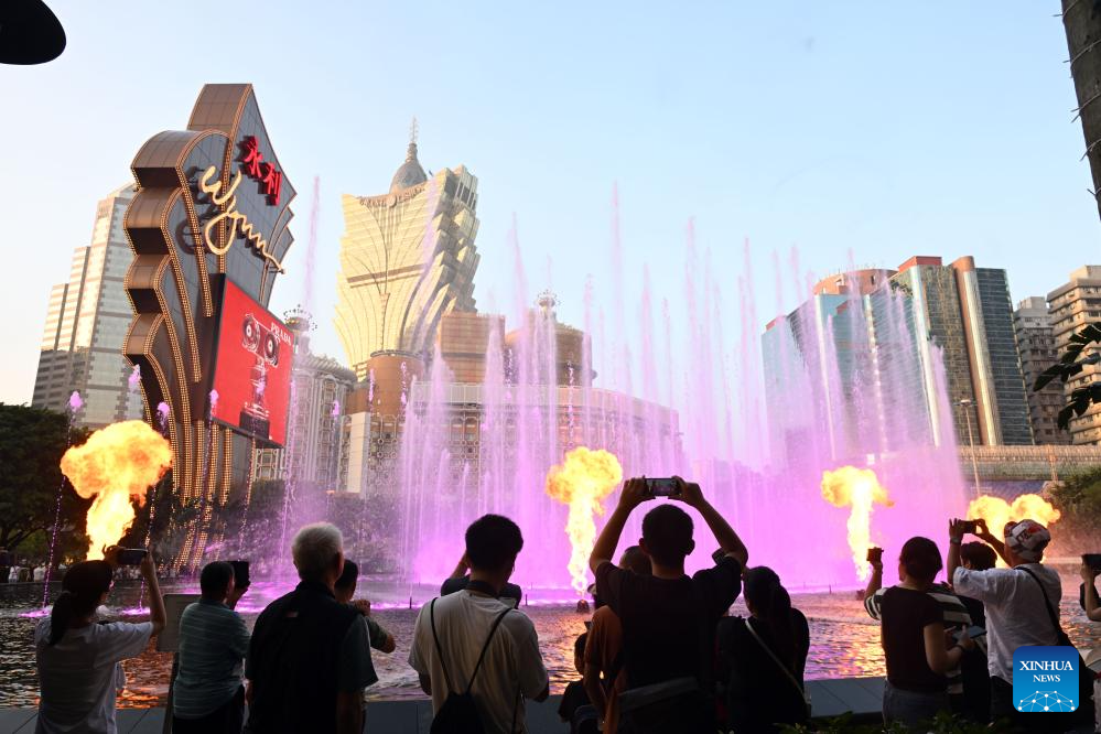 People take photos of a fountain in south China's Macao, Nov. 17, 2024. This year marks the 25th anniversary of Macao's return to the motherland. After 25 years of development, Macao has become a world renowned tourism destination, where Eastern and Western cultures have co-existed for over 400 years. (Xinhua/Jin Liangkuai)