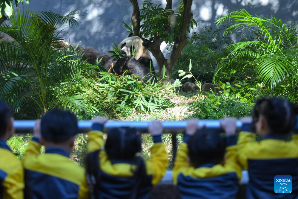 Children look at a panda at Seac Pai Van Park in south China's Macao, Nov. 29, 2024. This year marks the 25th anniversary of Macao's return to the motherland. After 25 years of development, Macao has become a world renowned tourism destination, where Eastern and Western cultures have co-existed for over 400 years. (Xinhua/Cheong Kam Ka)