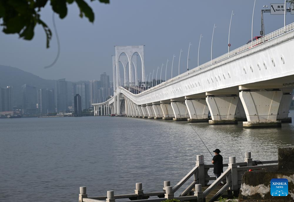 A person fishes near the Sai Van Bridge in south China's Macao, Nov. 17, 2024. This year marks the 25th anniversary of Macao's return to the motherland. After 25 years of development, Macao has become a world renowned tourism destination, where Eastern and Western cultures have co-existed for over 400 years. (Xinhua/Jin Liangkuai)