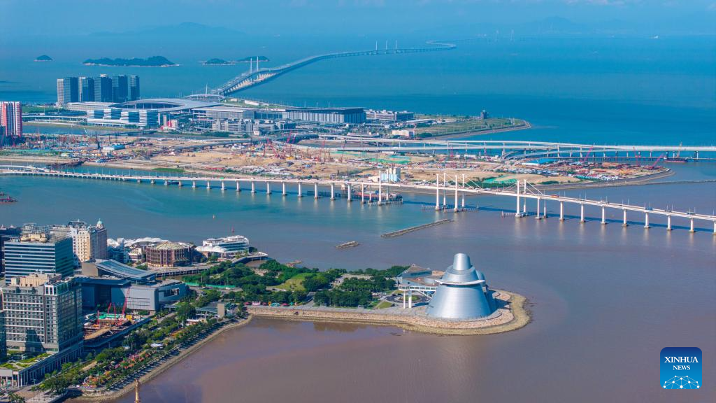 An aerial drone photo shows the Macao Science Center (front), Macao New Urban Zone Area A and the Hong Kong-Zhuhai-Macao Bridge (back) on Aug. 3, 2024. This year marks the 25th anniversary of Macao's return to the motherland. After 25 years of development, Macao has become a world renowned tourism destination, where Eastern and Western cultures have co-existed for over 400 years. (Xinhua/Cheong Kam Ka)