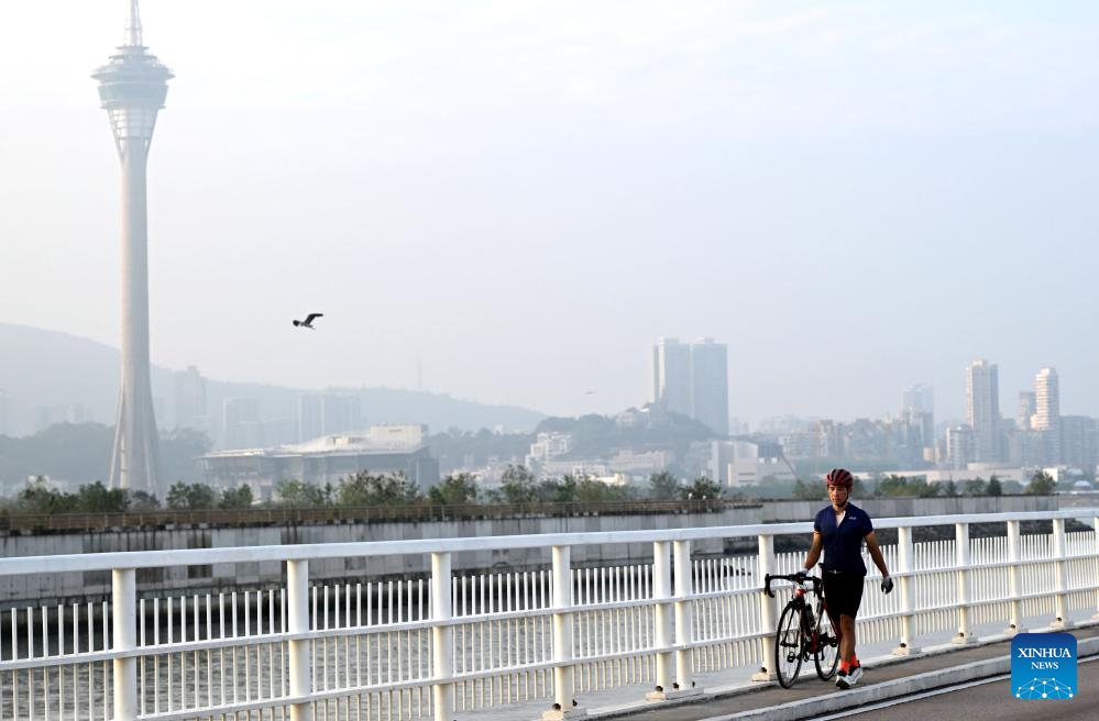 A cyclist walks on the Governador Nobre de Carvalho Bridge in south China's Macao, Nov. 17, 2024. This year marks the 25th anniversary of Macao's return to the motherland. After 25 years of development, Macao has become a world renowned tourism destination, where Eastern and Western cultures have co-existed for over 400 years. (Xinhua/Jin Liangkuai)