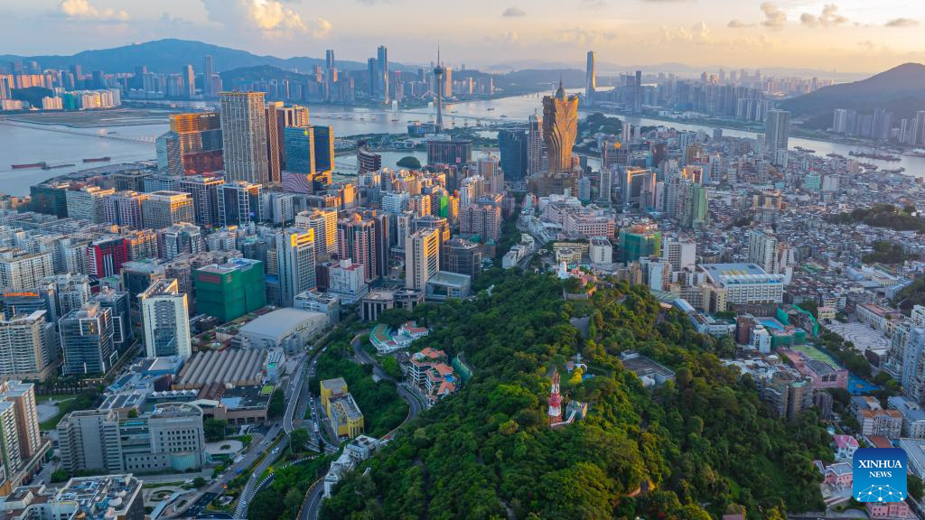 An aerial drone photo shows a view of Macao Peninsula on Aug. 3, 2024. This year marks the 25th anniversary of Macao's return to the motherland. After 25 years of development, Macao has become a world renowned tourism destination, where Eastern and Western cultures have co-existed for over 400 years. (Xinhua/Cheong Kam Ka)