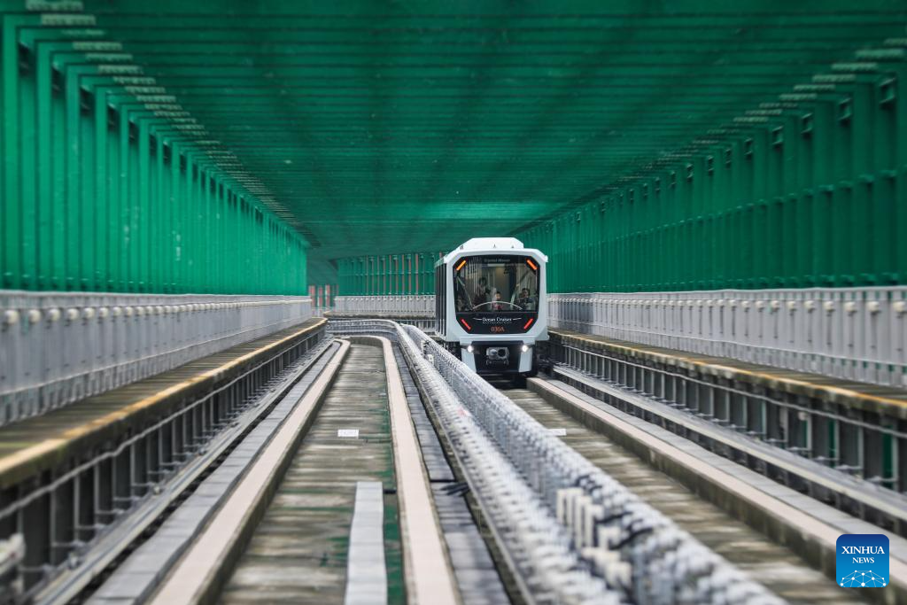 A light rail train is pictured in south China's Macao, Nov. 21, 2024. This year marks the 25th anniversary of Macao's return to the motherland. After 25 years of development, Macao has become a world renowned tourism destination, where Eastern and Western cultures have co-existed for over 400 years. (Xinhua/Wang Yiliang)