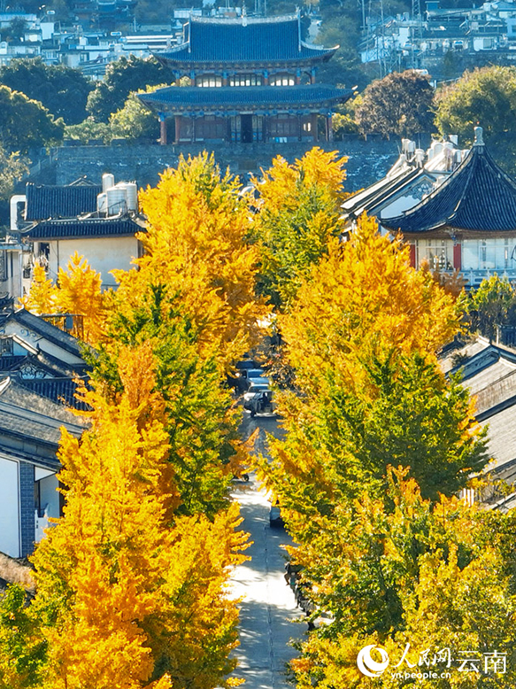 A photo shows the beauty of ginkgo leaves in the old town of Dali, southwest China's Yunnan Province. (Photo by Dong Mengliang)