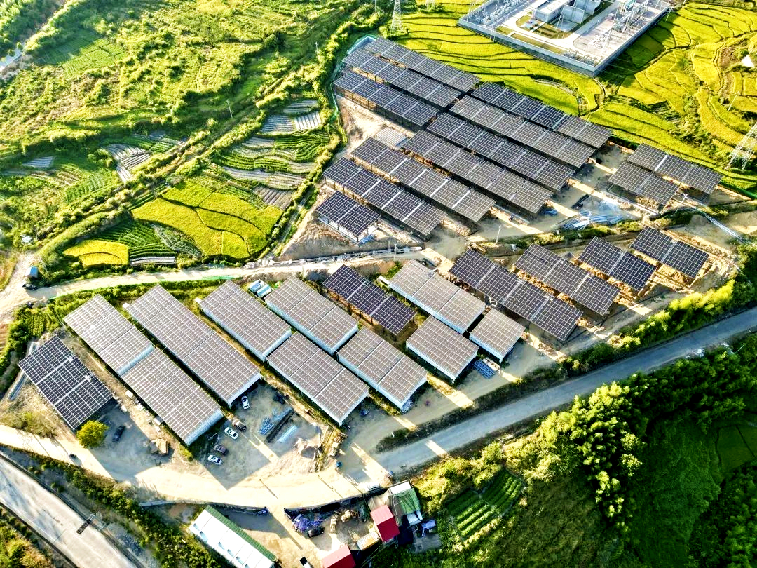 Photo shows mushroom sheds under solar panels in Gutian county, Ningde city, southeast China's Fujian Province. (Photo courtesy of the media convergence center of Gutian county)