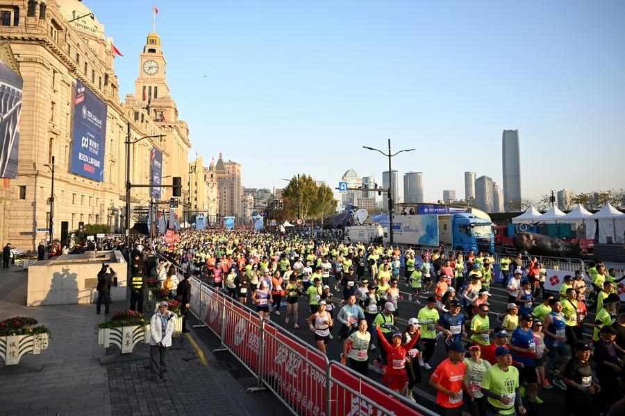 Participants run during the 2024 Shanghai Marathon in Shanghai, east China, Dec. 1, 2024. (Photo by Chen Haoming/Xinhua)