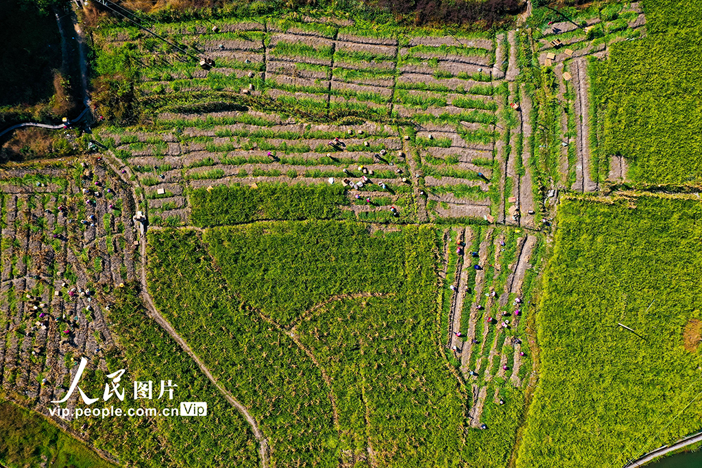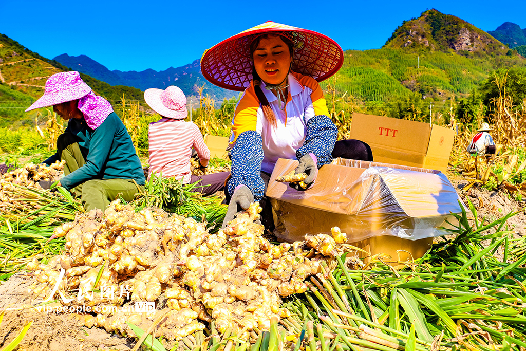 In Datang village, Xihe township, Mengshan county, south China's Guangxi Zhuang Autonomous Region, ginger farmers were busy harvesting ginger, trimming leaves, and packing them into boxes, with fields bustling with activity on Dec. 2, 2024.