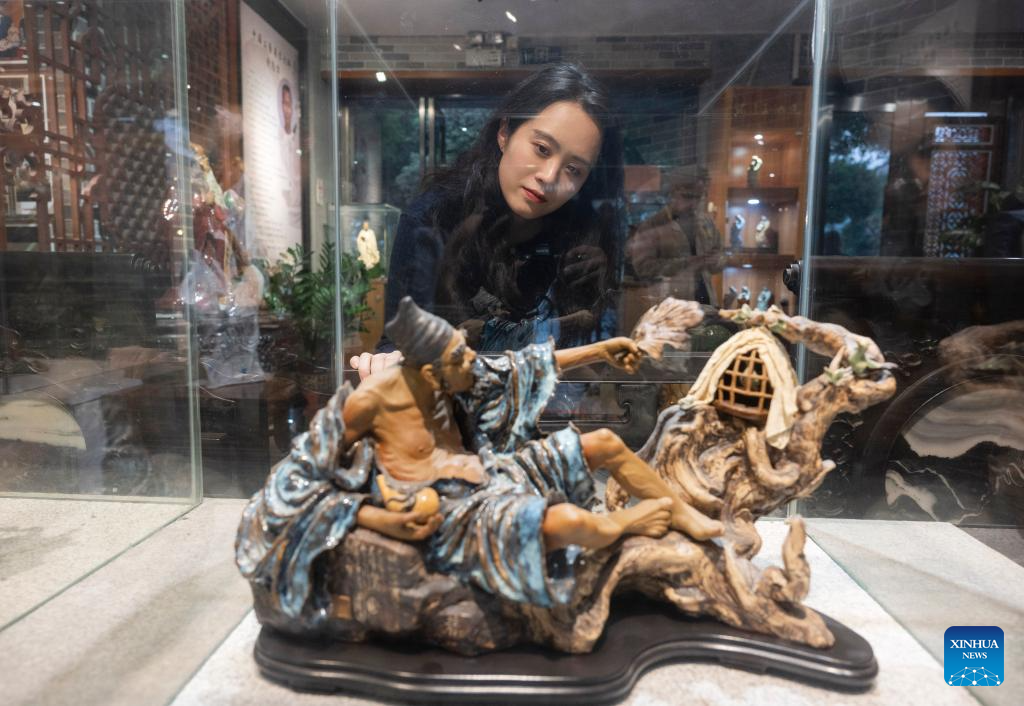 A visitor views a pottery art piece at an art museum of Meitaowan in Foshan, south China's Guangdong Province, Dec. 3, 2024. Meitaowan, literally translated as "bay of beautiful ceramics," has been known for its development in ceramic arts. The municipal government established this area by transforming old factory buildings into cultural facilities and creative spaces. It is now home to studios of numerous ceramic art masters and fashion brands that aim to drive urban renewal and industrial transformation. (Xinhua/Cai Yang)