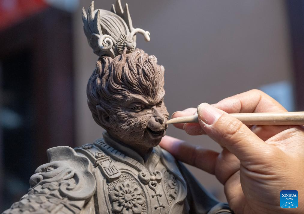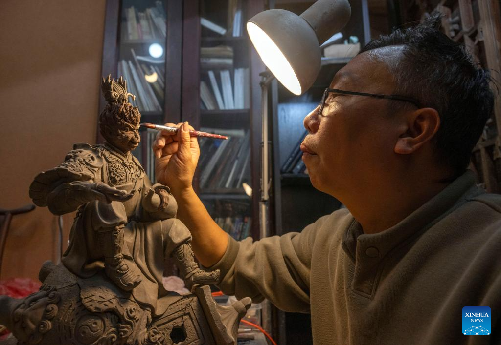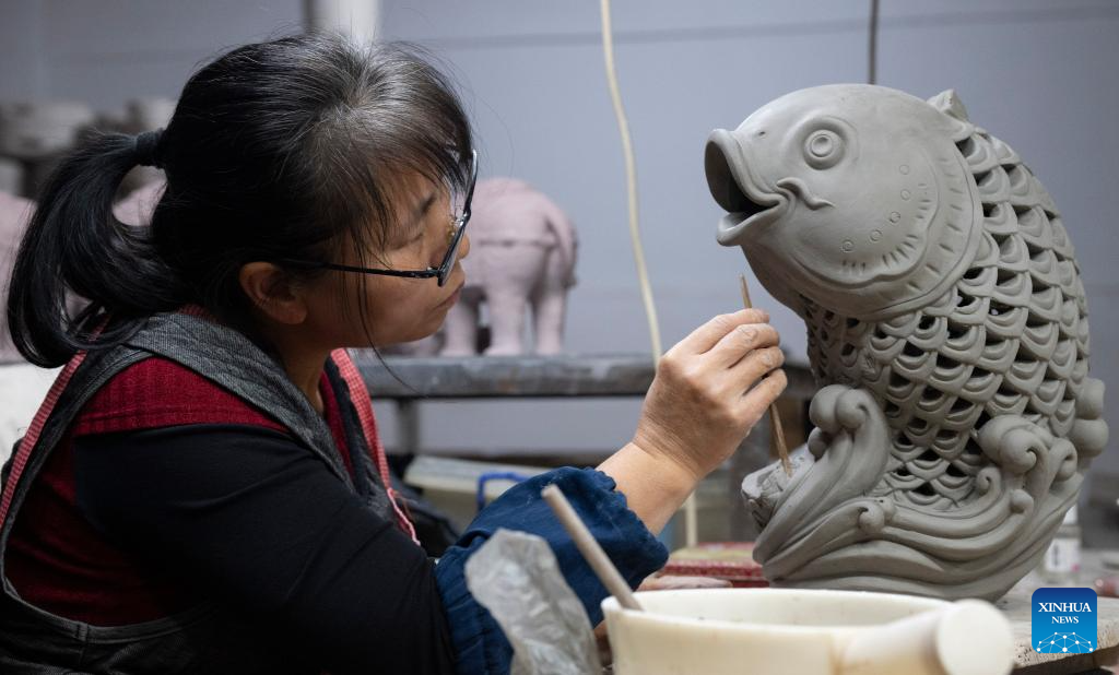Craft artist Feng Zhiwei makes a pottery sculpture at his art studio of Meitaowan in Foshan, south China's Guangdong Province, Dec. 3, 2024. Meitaowan, literally translated as "bay of beautiful ceramics," has been known for its development in ceramic arts. The municipal government established this area by transforming old factory buildings into cultural facilities and creative spaces. It is now home to studios of numerous ceramic art masters and fashion brands that aim to drive urban renewal and industrial transformation. (Xinhua/Cai Yang)