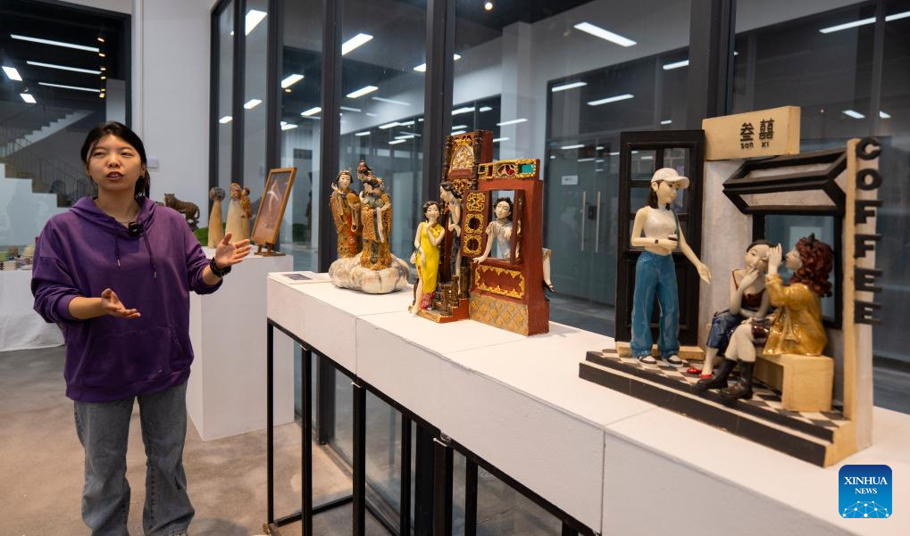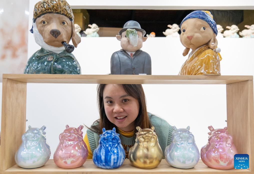 Craft artist Wu Weiwei introduces pottery pieces with creative elements at an art studio of Meitaowan in Foshan, south China's Guangdong Province, Dec. 3, 2024. Meitaowan, literally translated as "bay of beautiful ceramics," has been known for its development in ceramic arts. The municipal government established this area by transforming old factory buildings into cultural facilities and creative spaces. It is now home to studios of numerous ceramic art masters and fashion brands that aim to drive urban renewal and industrial transformation. (Xinhua/Cai Yang)