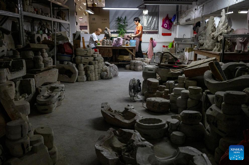 Workers assemble greenware at an art studio of Meitaowan in Foshan, south China's Guangdong Province, Dec. 3, 2024. Meitaowan, literally translated as "bay of beautiful ceramics," has been known for its development in ceramic arts. The municipal government established this area by transforming old factory buildings into cultural facilities and creative spaces. It is now home to studios of numerous ceramic art masters and fashion brands that aim to drive urban renewal and industrial transformation. (Xinhua/Cai Yang)