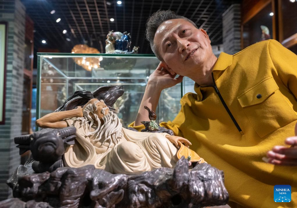 Craft artist Huang Zhiwei introduces one of his pottery sculptures at his art studio of Meitaowan in Foshan, south China's Guangdong Province, Dec. 3, 2024. Meitaowan, literally translated as "bay of beautiful ceramics," has been known for its development in ceramic arts. The municipal government established this area by transforming old factory buildings into cultural facilities and creative spaces. It is now home to studios of numerous ceramic art masters and fashion brands that aim to drive urban renewal and industrial transformation. (Xinhua/Cai Yang)