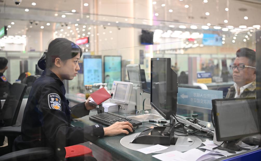 A staff member of customs checks the identity of a passenger at Hengqin Port on Nov. 25, 2024. In 2021, the Chinese central authorities decided to build the Guangdong-Macao in-depth cooperation zone in Hengqin, Zhuhai City, making the island an important new growth point for Macao's economy.