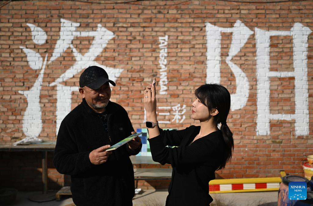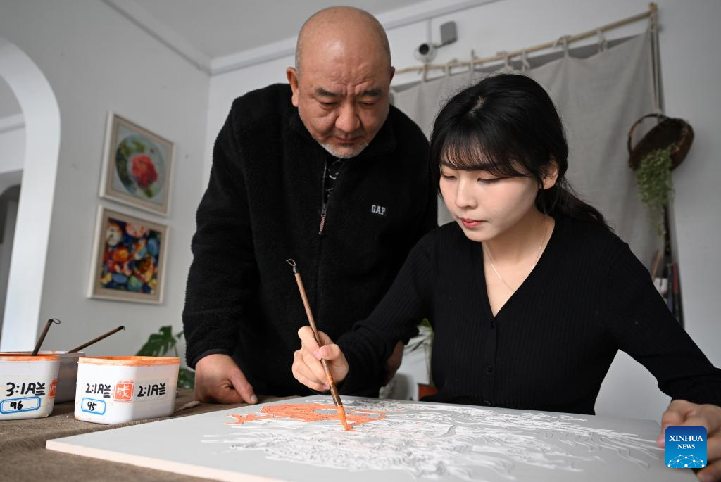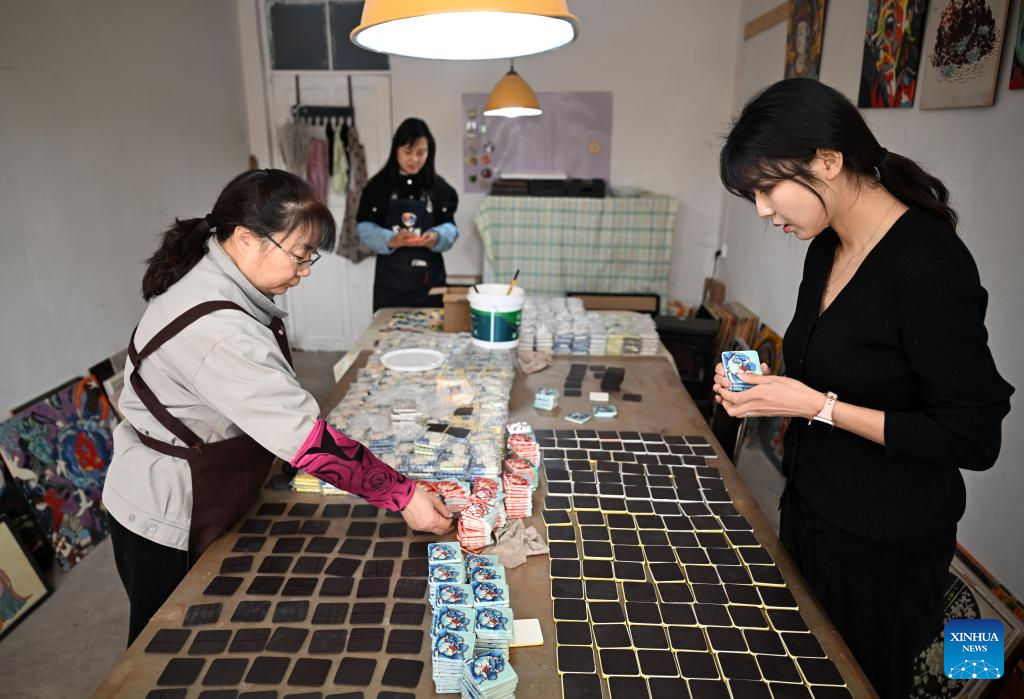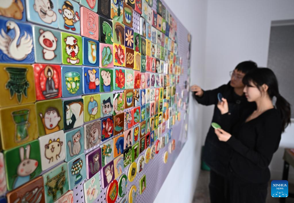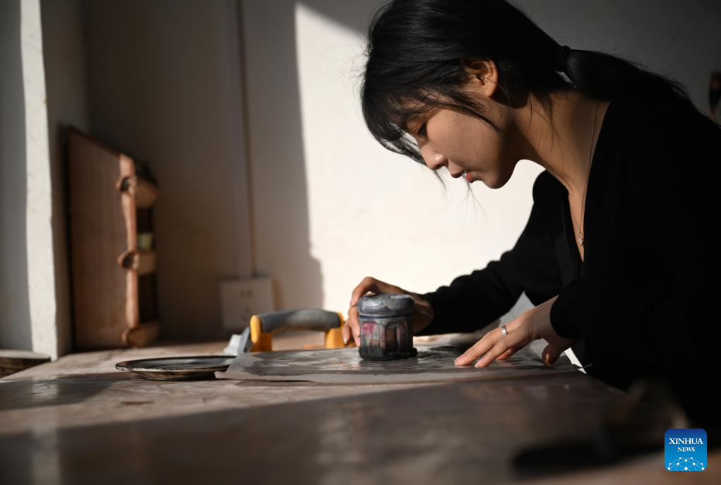 Cheng Guo makes a tri-colored glazed pottery printmaking artwork at her art ceramics studio in Luoyang, central China's Henan Province, Dec. 3, 2024. (Xinhua/Li Jianan)