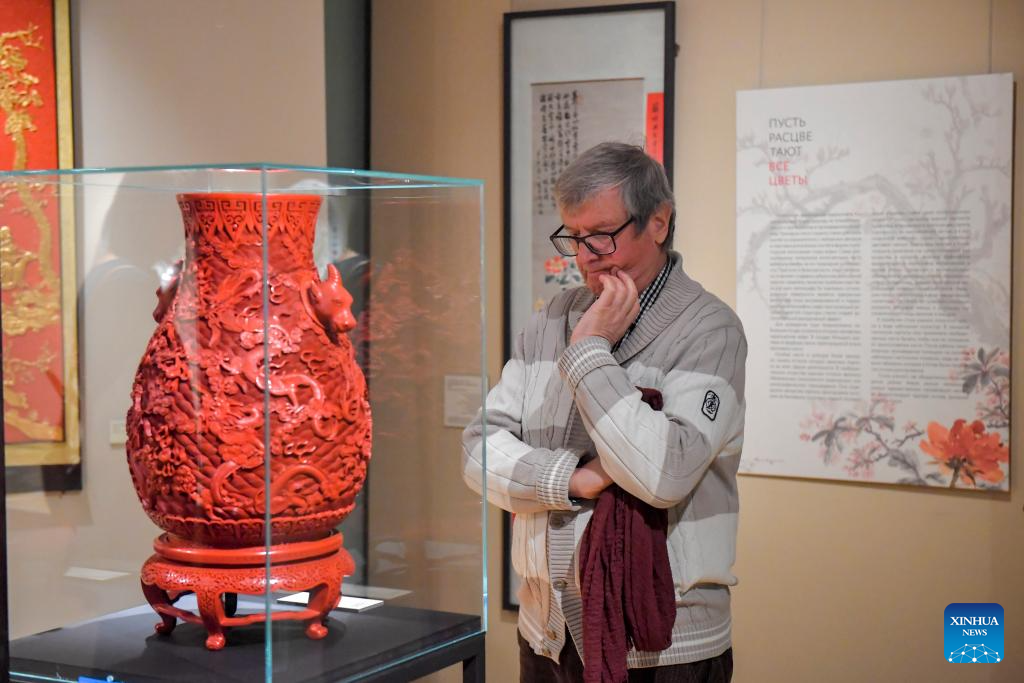 A visitor looks at an exhibit at an exhibition of Chinese art at the State Museum of Oriental Art in Moscow, capital of Russia, on Dec. 4, 2024. (Photo by Alexander Zemlianichenko Jr/Xinhua)