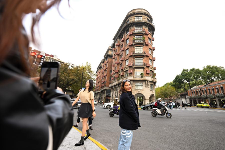 A tourist from Thailand poses for photo in front of the Wukang Building in east China's Shanghai, Dec. 3, 2024. (Photo by Chen Haoming/Xinhua)