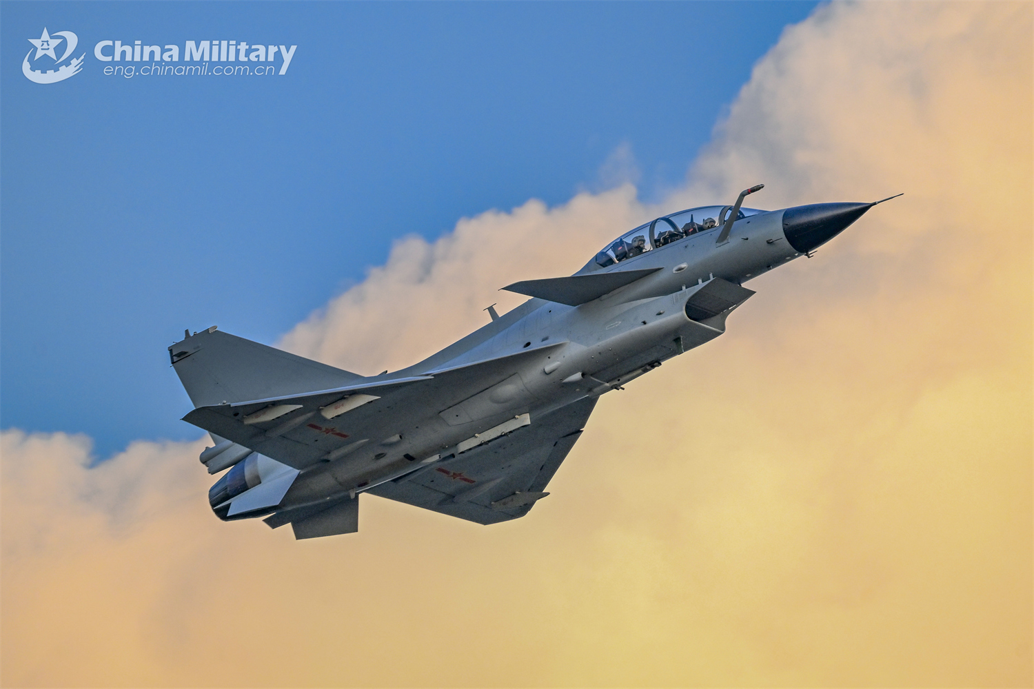 J-10 multi-role fighter jets attached to an aviation brigade under Chinese PLA Air Force fly in formation during a flight training exercise on October 30, 2024. (eng.chinamil.com.cn/Photo by Shang Yanjie)