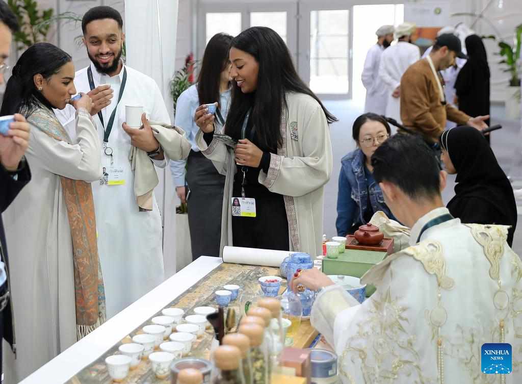 People taste Chinese tea at the China Pavilion during the 16th Conference of the Parties (COP16) to the United Nations Convention to Combat Desertification (UNCCD) in Riyadh, Saudi Arabia, on Dec. 4, 2024. Covering more than 600 square meters, the China Pavilion is the second-largest national pavilion at the event. Its exhibition, themed "Cross-Century Green Great Wall, China's Restoration in Action," showcases the nation's battle against desertification, particularly through the Three-North Shelter Forest Program, a major national initiative aimed at reversing land desertification. (Xinhua/Wang Dongzhen)