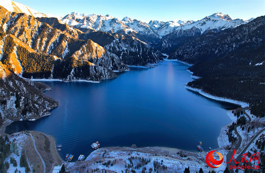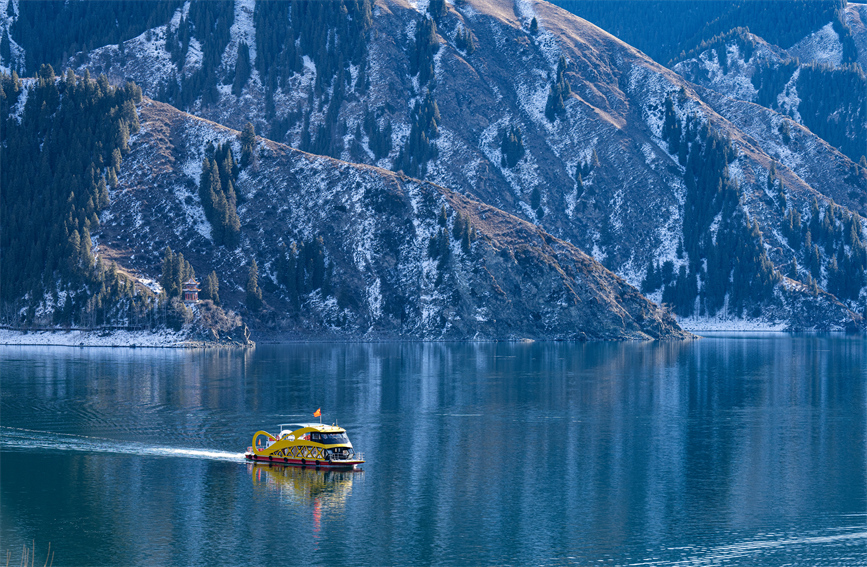 In early winter, the shores of Tianchi Lake in Changji Hui Autonomous Prefecture, northwest China's Xinjiang Uygur Autonomous Region, are adorned with snow-clad spruce trees and tranquil waters.