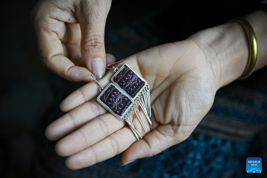 A craftswoman of Li ethnic group shows a pair of earrings with traditional Li textile elements at home in Donghe Town of Dongfang City, south China's Hainan Province, June 7, 2023.?(Xinhua/Pu Xiaoxu)