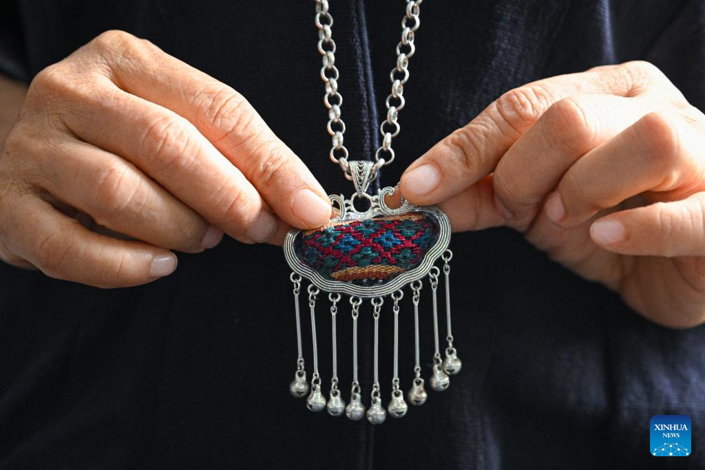 A craftswoman of Li ethnic group shows a pendant with traditional Li textile elements at home in Donghe Town of Dongfang City, south China's Hainan Province, June 7, 2023.?(Xinhua/Pu Xiaoxu)