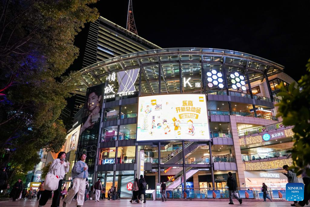 Tourists walk past a shopping mall in Kunming City, southwest China's Yunnan Province, Dec. 6, 2024. In recent years, Kunming has stepped up its efforts to enrich citizen's life by developing night fair compounds. (Xinhua/Wang Jingyi)