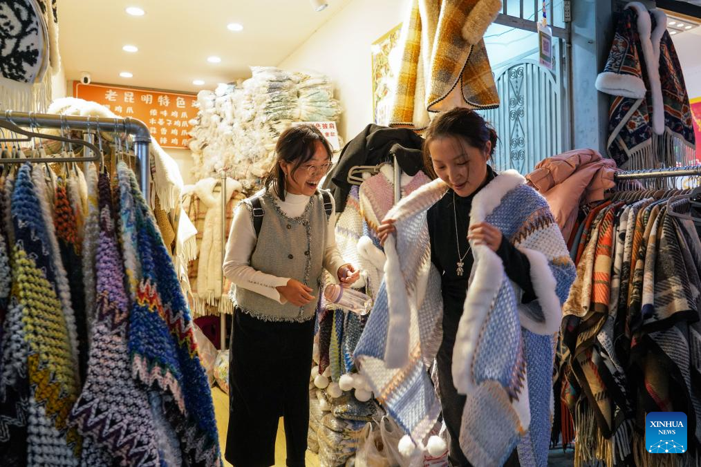 Tourists select clothes on a street at night in Kunming City, southwest China's Yunnan Province, Dec. 6, 2024. In recent years, Kunming has stepped up its efforts to enrich citizen's life by developing night fair compounds. (Xinhua/Wang Jingyi)