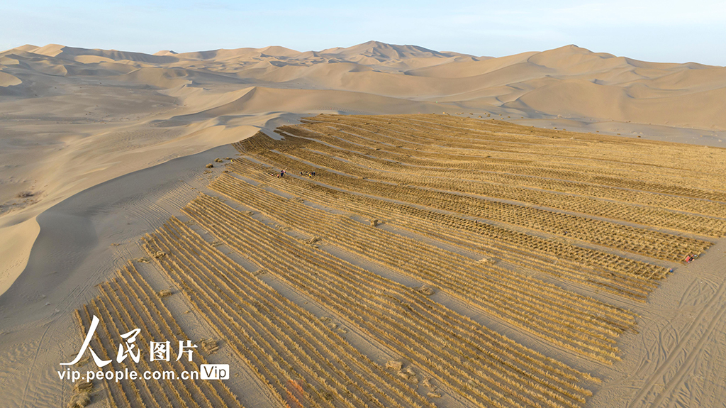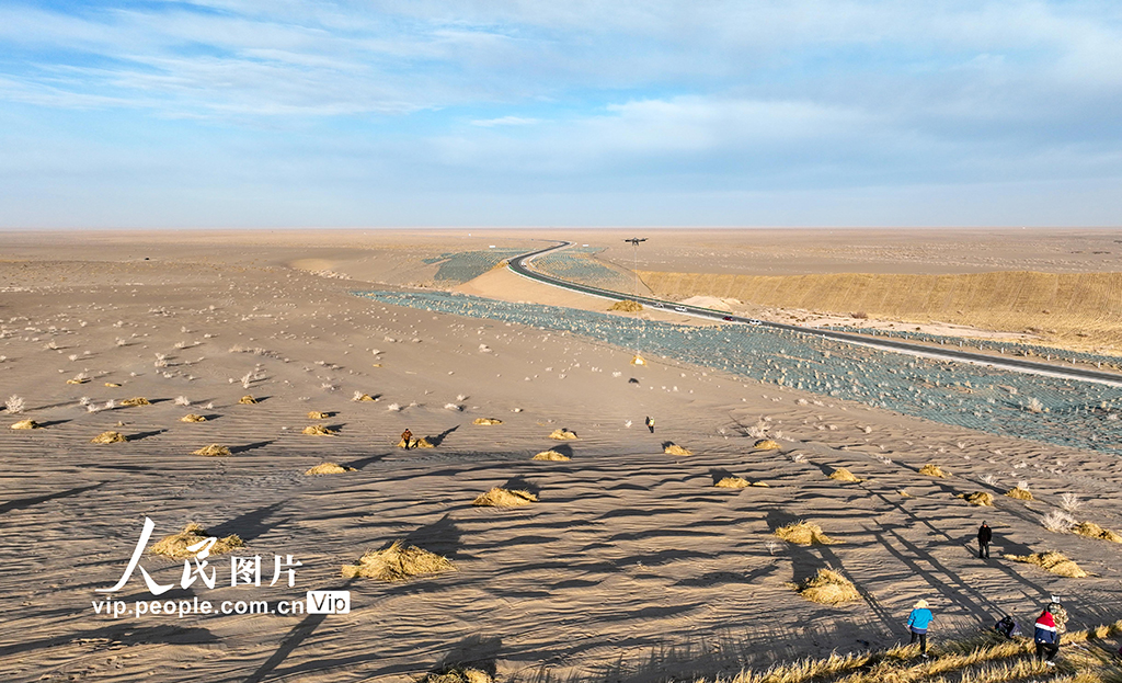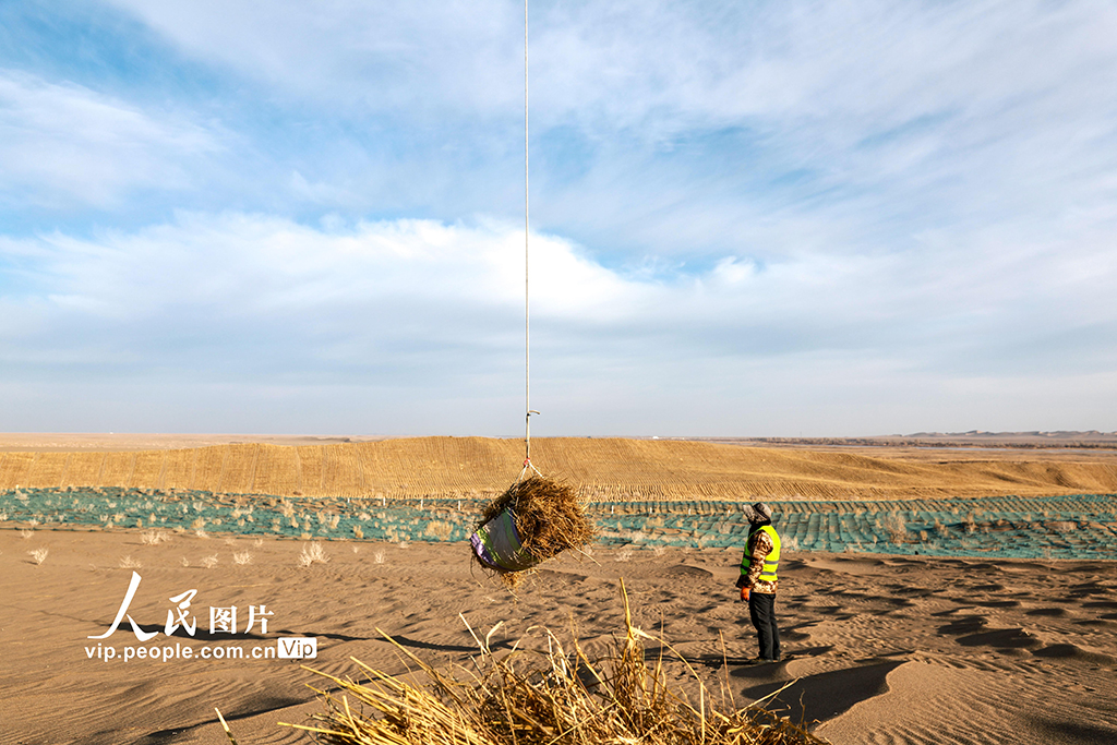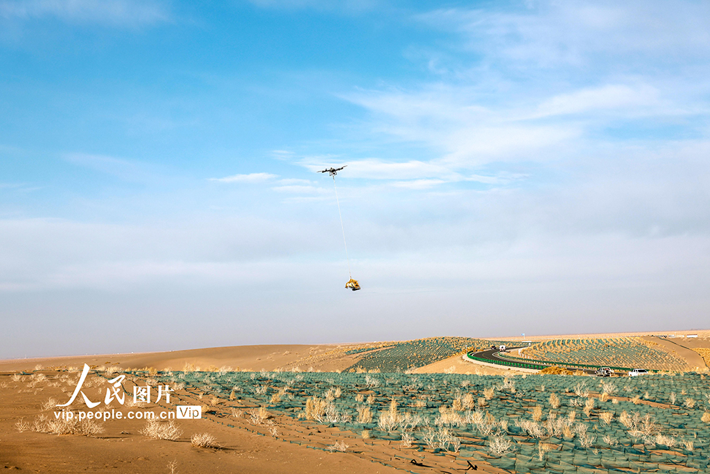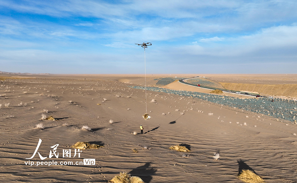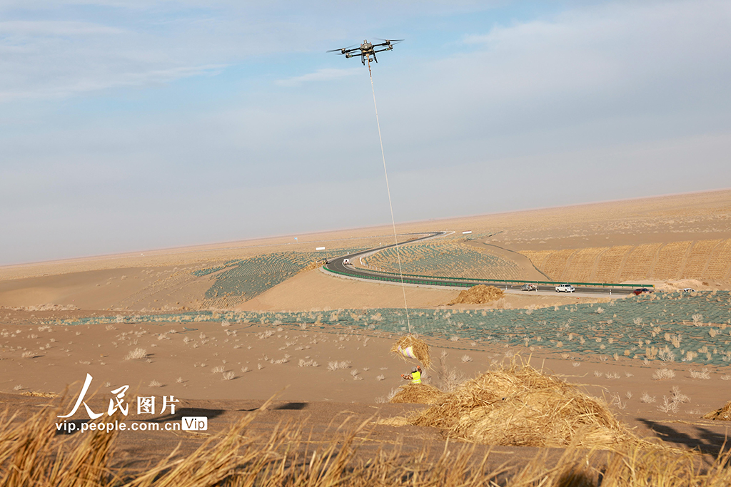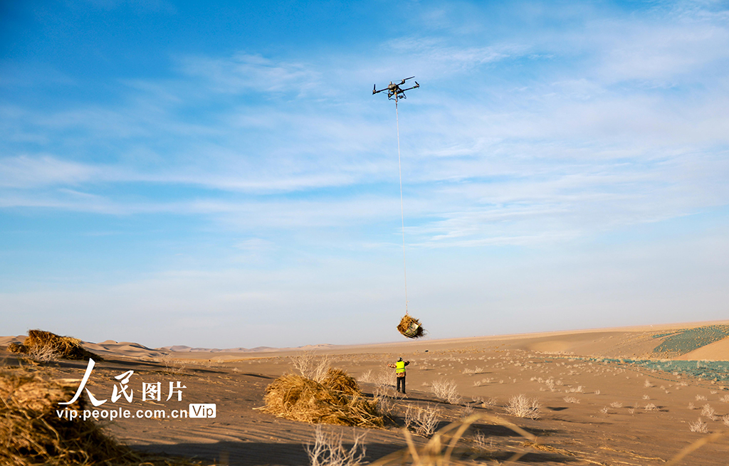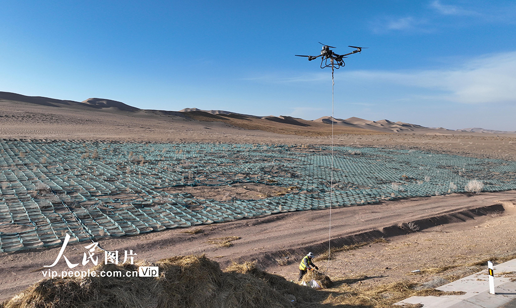 On Dec. 3, 2024, in Jinta county, Jiuquan city, northwest China's Gansu Province, drones were used to carry straw deep into the desert as part of the desertification control efforts under the Three-North Shelterbelt Forest Program, one of the most important projects in China's sand control history.