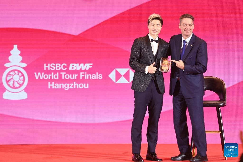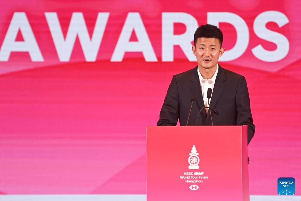 Chen Long of China makes a speech at the annual awards ceremony during the BWF World Tour welcome banquet in Hangzhou, east China's Zhejiang Province, Dec. 9, 2024. (Xinhua/Huang Zongzhi)