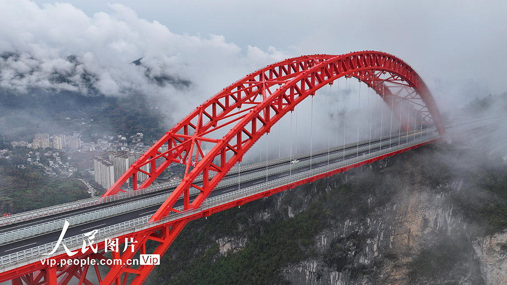 Loushuihe Bridge in Hefeng county, Enshi Tujia and Miao Autonomous Prefecture, central China's Hubei Province, was enveloped in mist, presenting a magnificent scene on Dec. 5, 2024.