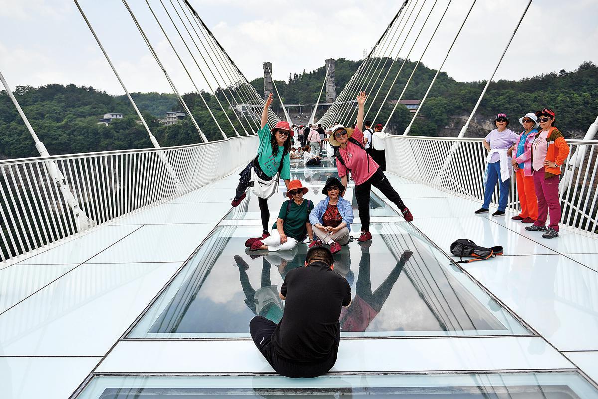 Tourists from South Korea take pictures on a glass bridge in Zhangjiajie in May. (Chen Zhenhai/Xinhua)