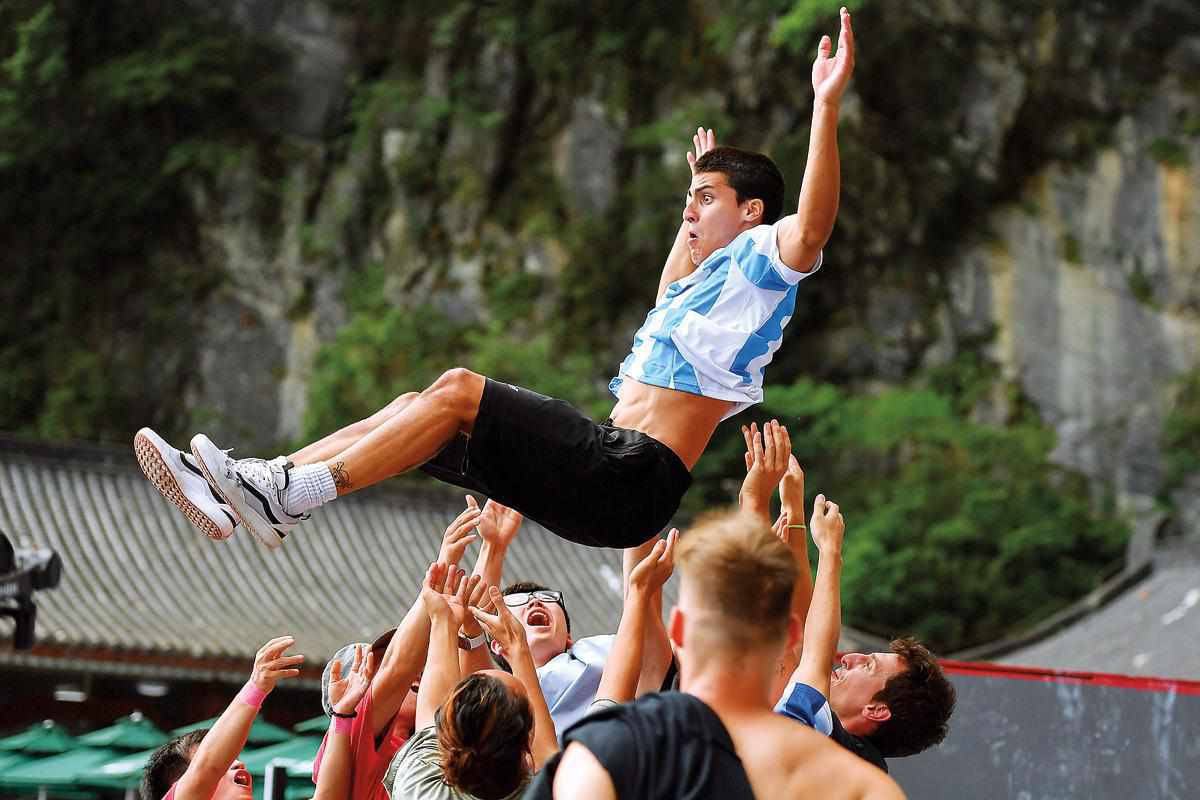 Argentina's Lautaro Chialvo celebrates after winning the 2024 Parkour on the Highest Ladder at Tianmen Mountain National Forest Park in Zhangjiajie, Hunan province, on Aug 25. (Chen Zeguo/Xinhua)