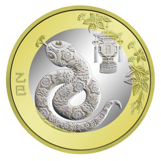 The reverse side of the copper alloy coin showcases a snake image that blends the traditional paper-cutting art with a New Year's painting. It also includes patterns of a lamp and ginseng, an herb in traditional Chinese medicine, among other elements.