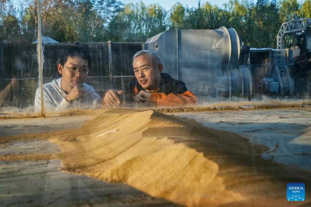 Lu Qi (R) works with a colleague at an experimental center in Dengkou County of Bayannur, north China's Inner Mongolia Autonomous Region, on Oct. 11, 2024. (Photo by Justin Jin/UNEP/Handout via Xinhua)