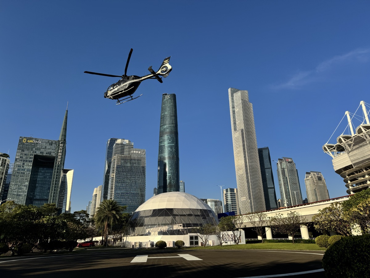 A helicopter flies along the low-altitude flight route linking Shenzhen's downtown area and Guangzhou Haixinsha Park to Guangzhou Baiyun International Airport in Guangzhou, Guangdong province, at the end of October. (Photo/China Daily)