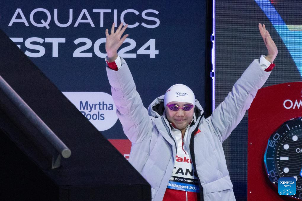Tang Qianting of China waves to spectators before the women's 100m breaststroke semifinal at the World Aquatics Swimming Championships (25m) in Budapest, Hungary, Dec. 11, 2024. (Photo by Attila Volgyi/Xinhua)