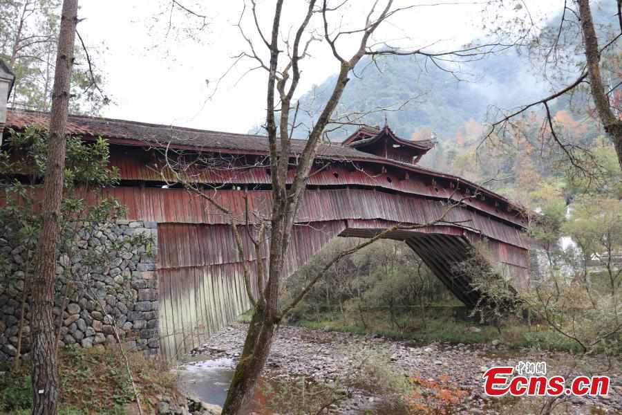 A view of Yonggui Bridge, a wooden arch bridge, in Qingyuan County of Lishui, east China's Zhejiang Province, Dec. 11, 2024. (China News Service/Fu Feiyang)