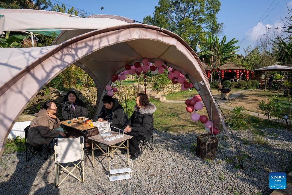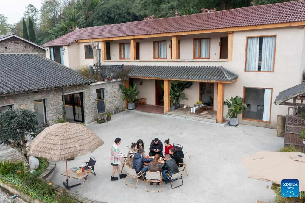 Tourists are seen at a homestay in Tianfu Town of Beibei District, southwest China's Chongqing Municipality, Dec. 11, 2024. In recent years, the town of Tianfu, with unique natural scenery as well as abundant resources for cultural tourism in its countryside, has promoted the improvement of village environment and the upgrading of infrastructure. The town has transformed vacant rural houses into a group of high-quality homestays, which not only accommodate tourists with an immersive rural experience, but also bring lucrative job opportunities to local villagers. (Xinhua/Liu Chan)