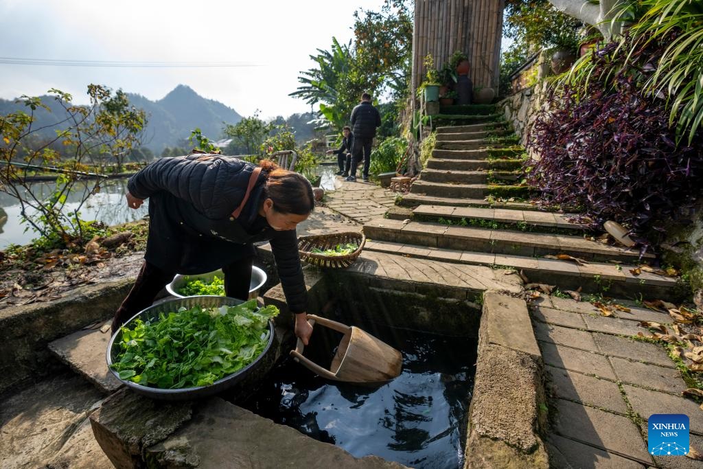 A staff member prepares vegetables for cooking at a homestay in Tianfu Town of Beibei District, southwest China's Chongqing Municipality, Dec. 11, 2024. In recent years, the town of Tianfu, with unique natural scenery as well as abundant resources for cultural tourism in its countryside, has promoted the improvement of village environment and the upgrading of infrastructure. The town has transformed vacant rural houses into a group of high-quality homestays, which not only accommodate tourists with an immersive rural experience, but also bring lucrative job opportunities to local villagers. (Xinhua/Liu Chan)