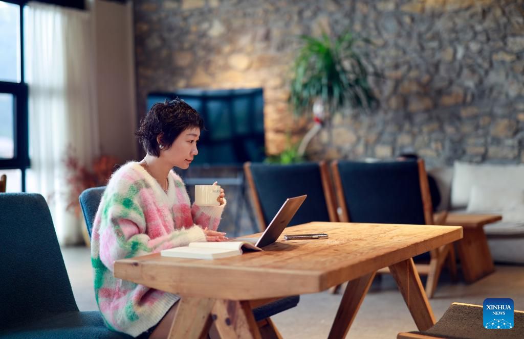 A homestay operator communicates on-line with booking clients at her homestay in Tianfu Town of Beibei District, southwest China's Chongqing Municipality, Dec. 11, 2024. In recent years, the town of Tianfu, with unique natural scenery as well as abundant resources for cultural tourism in its countryside, has promoted the improvement of village environment and the upgrading of infrastructure. The town has transformed vacant rural houses into a group of high-quality homestays, which not only accommodate tourists with an immersive rural experience, but also bring lucrative job opportunities to local villagers. (Xinhua/Liu Chan)
