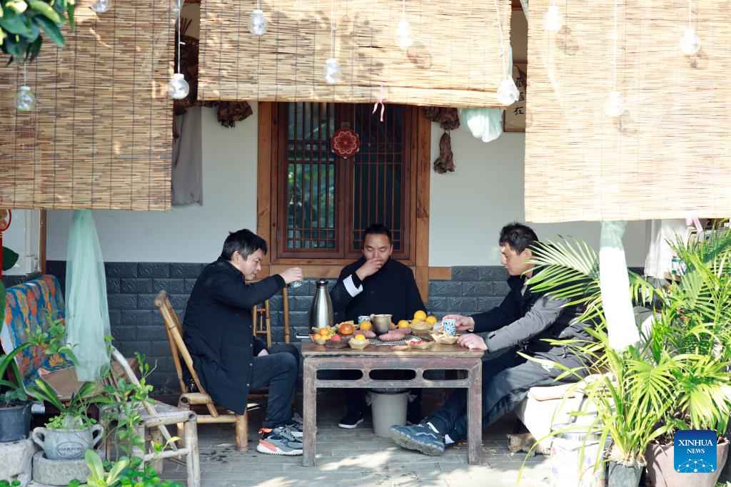 Tourists enjoy tea and snacks at a homestay in Tianfu Town of Beibei District, southwest China's Chongqing Municipality, Dec. 11, 2024. In recent years, the town of Tianfu, with unique natural scenery as well as abundant resources for cultural tourism in its countryside, has promoted the improvement of village environment and the upgrading of infrastructure. The town has transformed vacant rural houses into a group of high-quality homestays, which not only accommodate tourists with an immersive rural experience, but also bring lucrative job opportunities to local villagers. (Xinhua/Liu Chan)