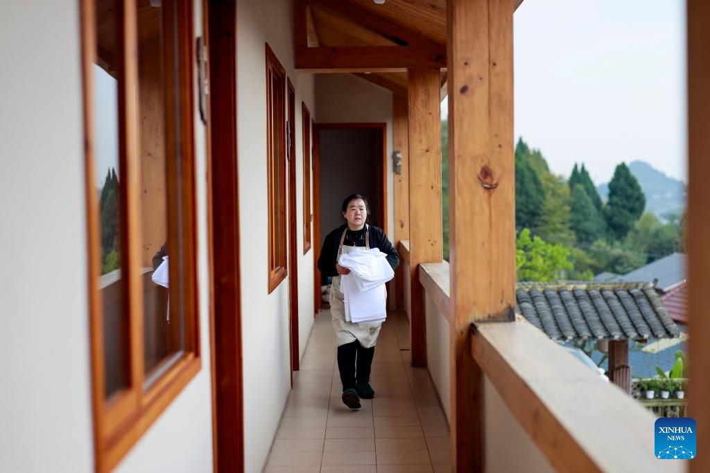 A staff member delivers bed sheets at a homestay in Tianfu Town of Beibei District, southwest China's Chongqing Municipality, Dec. 11, 2024. In recent years, the town of Tianfu, with unique natural scenery as well as abundant resources for cultural tourism in its countryside, has promoted the improvement of village environment and the upgrading of infrastructure. The town has transformed vacant rural houses into a group of high-quality homestays, which not only accommodate tourists with an immersive rural experience, but also bring lucrative job opportunities to local villagers. (Xinhua/Liu Chan)