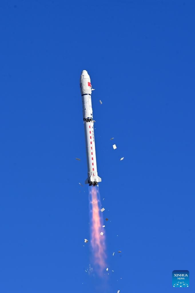 A Long March-2D carrier rocket carrying a group of five experiment satellites blasts off from the Jiuquan Satellite Launch Center in northwest China, Dec. 12, 2024. The five satellites were launched at 3:17 p.m. (Beijing Time) on Thursday and have entered the planned orbit. The launch was the 551st mission of the Long March carrier rocket series. (Photo by Wang Jiangbo/Xinhua)
