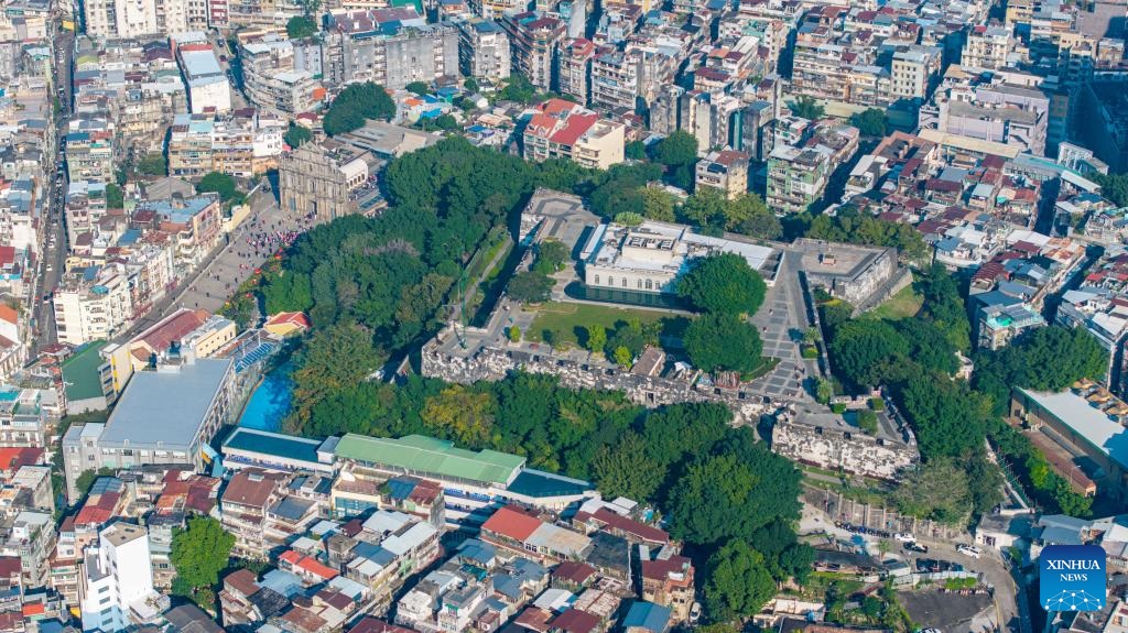 This aerial drone photo taken on Dec. 2, 2024 shows a view of the revitalized Mount Fortress in south China's Macao Special Administrative Region (SAR). The Macao SAR government has been committed to revitalizing and utilizing the historic areas in the region. An increasing number of locals and tourists visit these areas today to feel the charm of integration between traditional and modern cultures. (Xinhua/Cheong Kam Ka)