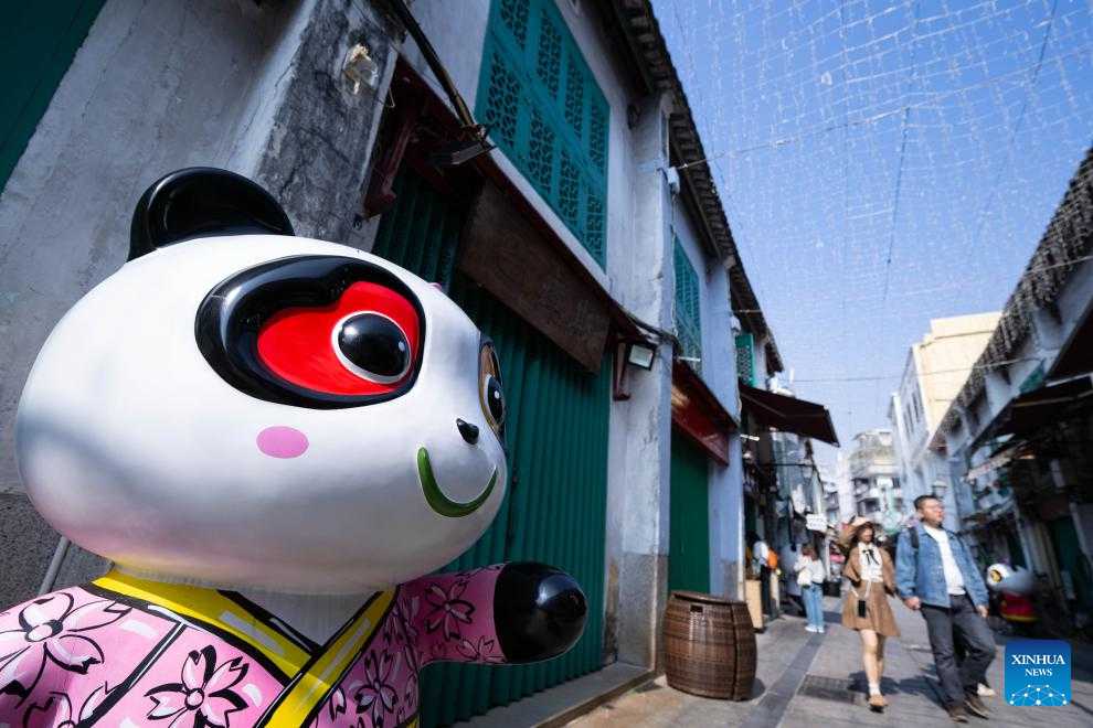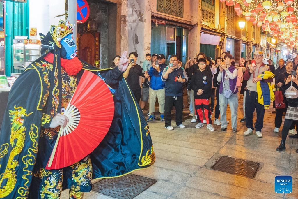 An actor performs face-changing stunt at the pedestrian area of revitalized Fulong New Street in south China's Macao Special Administrative Region (SAR) on Feb. 24, 2024. The Macao SAR government has been committed to revitalizing and utilizing the historic areas in the region. An increasing number of locals and tourists visit these areas today to feel the charm of integration between traditional and modern cultures. (Xinhua)