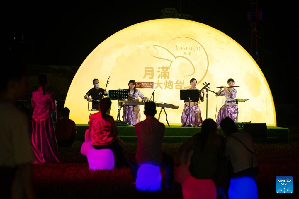 People enjoy a performance at the revitalized Mount Fortress in south China's Macao Special Administrative Region (SAR), Sept. 17, 2024. The Macao SAR government has been committed to revitalizing and utilizing the historic areas in the region. An increasing number of locals and tourists visit these areas today to feel the charm of integration between traditional and modern cultures. (Xinhua/Cheong Kam Ka)